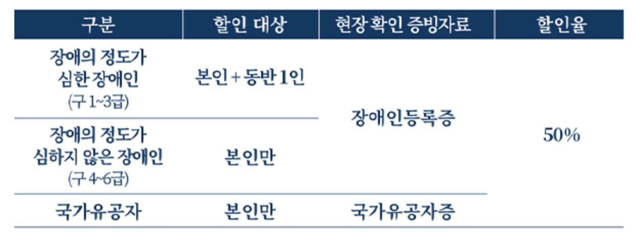 - 할인은 예매 시 적용 가능하며, 일반 권종으로 예매 후 현장에서 할인 적용(차액 환불)이 불가합니다.