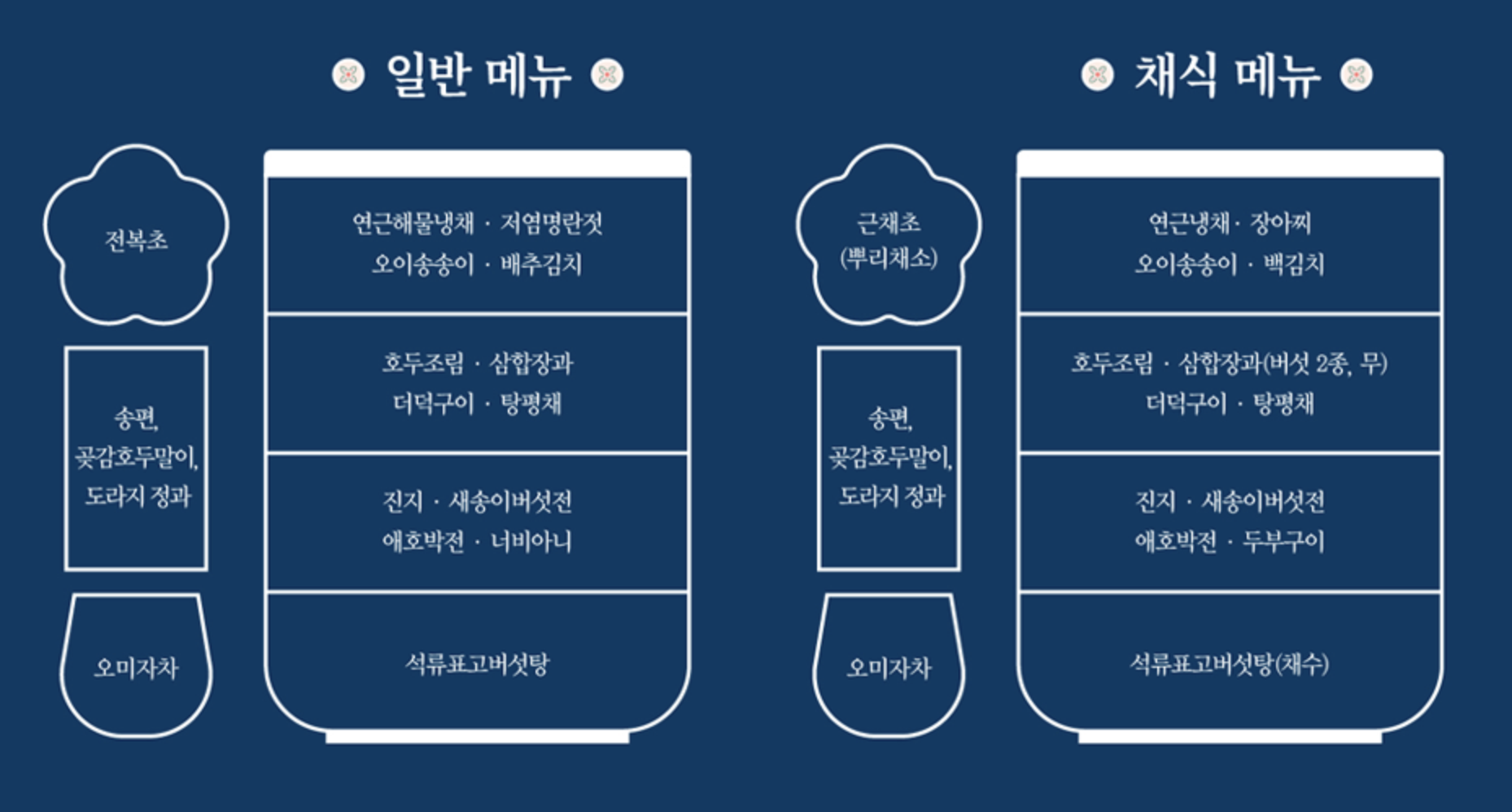 <도슭수라상>을 구성하는 열두 가지 음식에는 선조들의 음식 철학인 음양오행과 함께약과 음식은 그 근원이 같다는 약식동원의 의미가 담겨 있습니다.