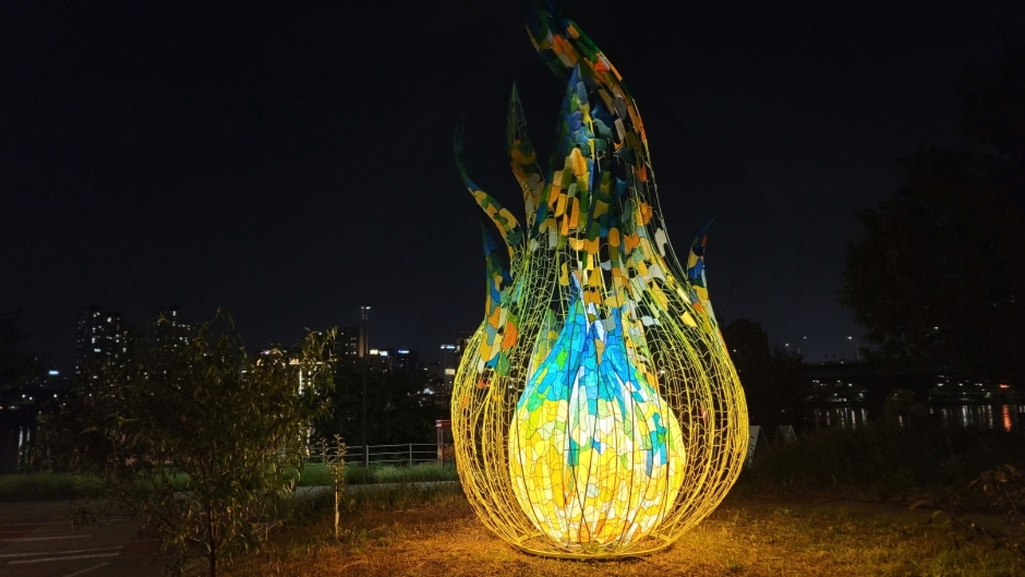 - 빛의 불꽃 조각 : 이 작품은 화염을 형상화한 대형 조각으로, 밤하늘을 배경으로 화려하게 빛납니다. 다양한 색상의 투명한 재료로 만들어져, 빛이 통과할 때마다 다채로운 색깔을 만들어내요.