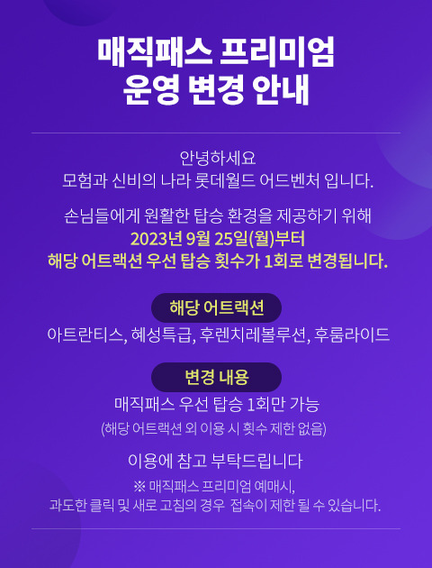 [1] 롯데월드 어드벤처 - 매직패스 프리미엄 (https://adventure.lotteworld.com/kor/price/premium-magic-pass/contentsid/283/index.do)