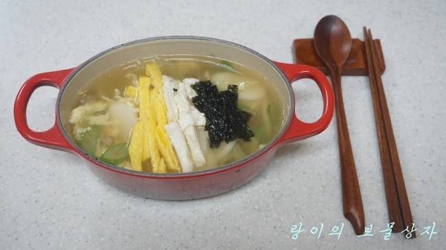 - 완성된 떡국 그릇에 담기 : 국물이 우러난 떡국을 그릇에 담고, 지단과 대파를 고명으로 올린 후 김가루를 뿌리면 맛있는 떡국 완성이에요!