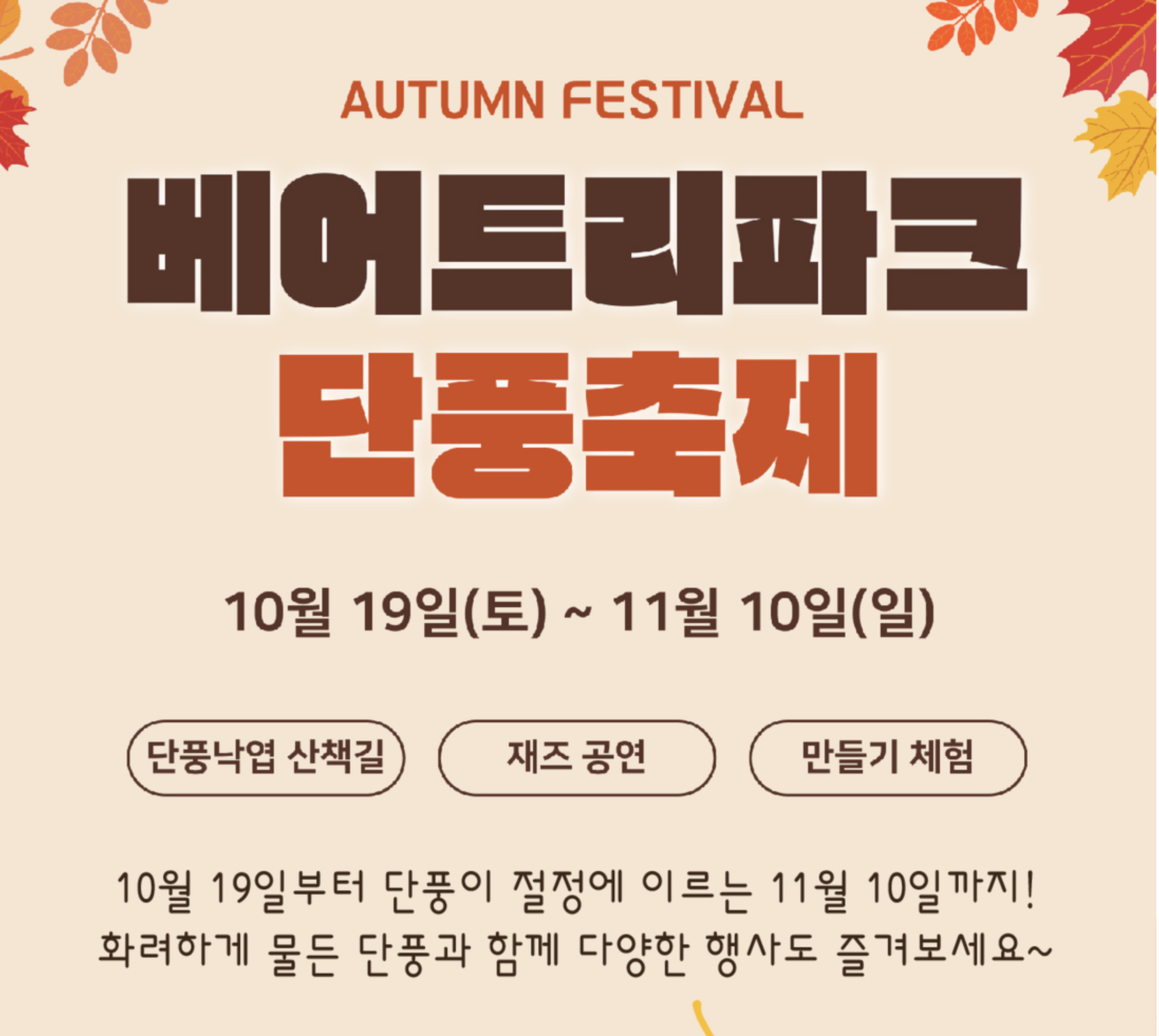 안녕하세요! 여러분, 요즘 날씨가 너무 좋지 않나요? 선선한 가을바람을 맞으며 단풍이 물든 길을 걸을 생각만 해도 벌써 마음이 설레는데 요. 그래서 이번에는 여러분께 특별한 단풍축제, 바로 세종 베어트리파크 단풍축제를 소개하려고 합니다.
