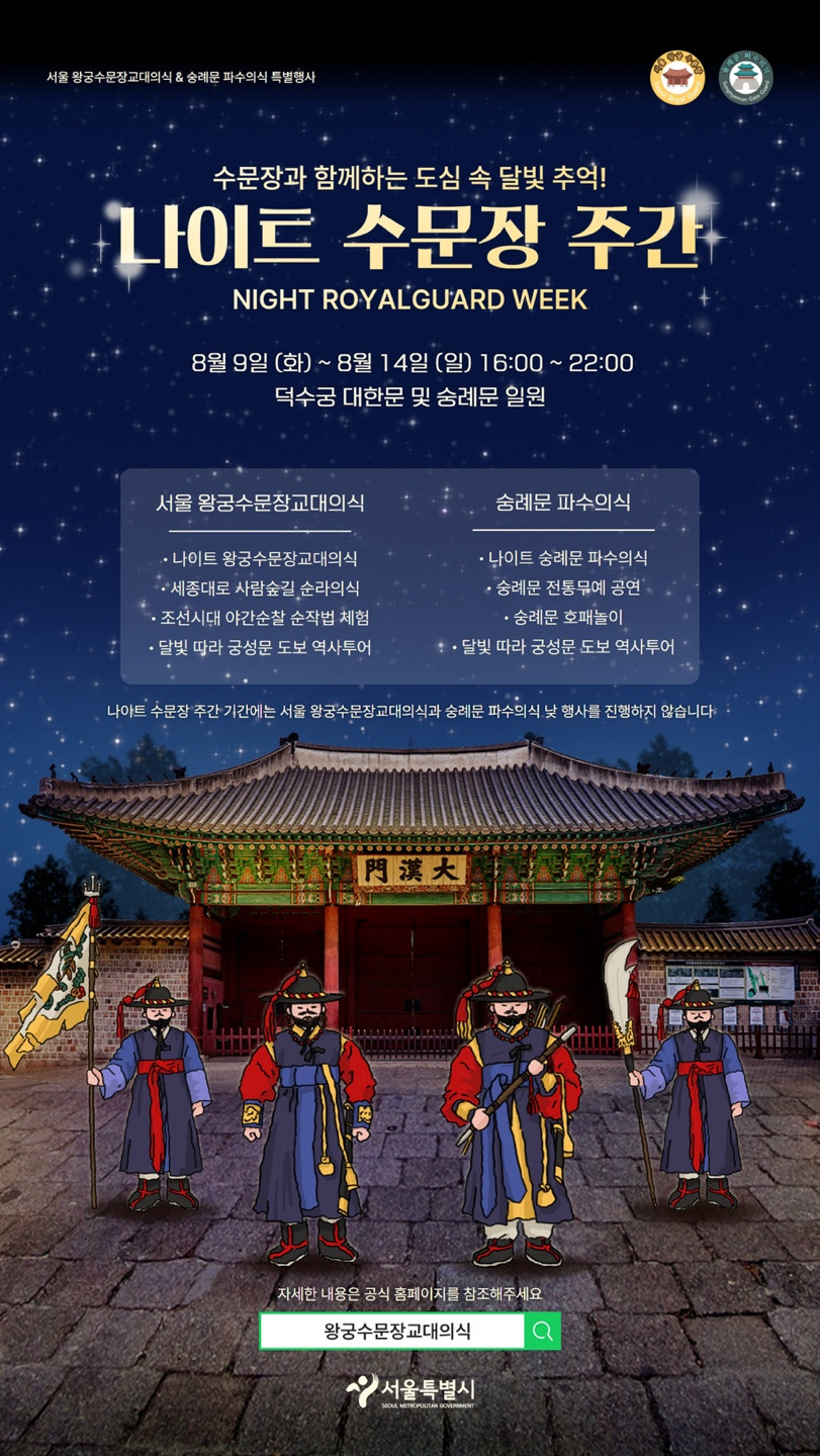 [4] 비짓서울 - 왕궁수문장 교대의식(덕수궁) | 서울 공식 관광정보 웹사이트 (https://korean.visitseoul.net/events/%EB%8D%95%EC%88%98%EA%B6%81-%EC%99%95%EA%B6%81%EC%88%98%EB%AC%B8%EC%9E%A5-%EA%B5%90%EB%8C%80%EC%9D%98%EC%8B%9D/KOP008609)