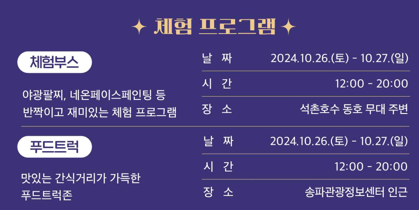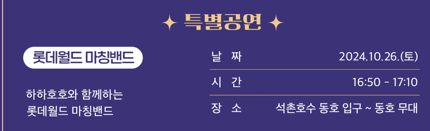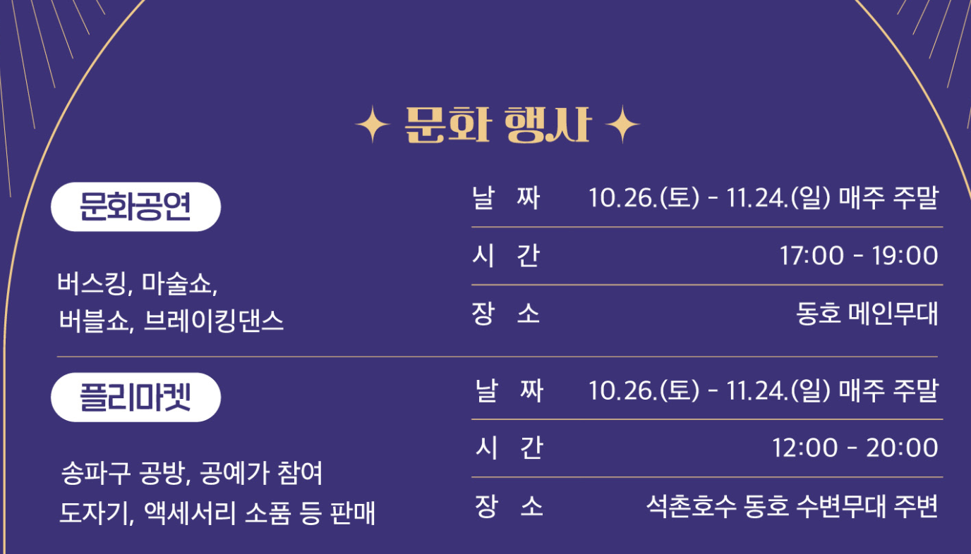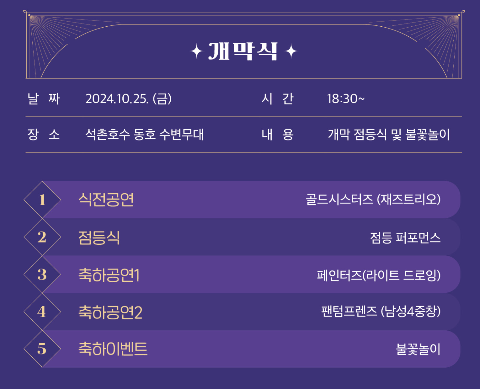 - 개막식 : 10. 25.(금) 18:30, 석촌호수 동호 수변무대