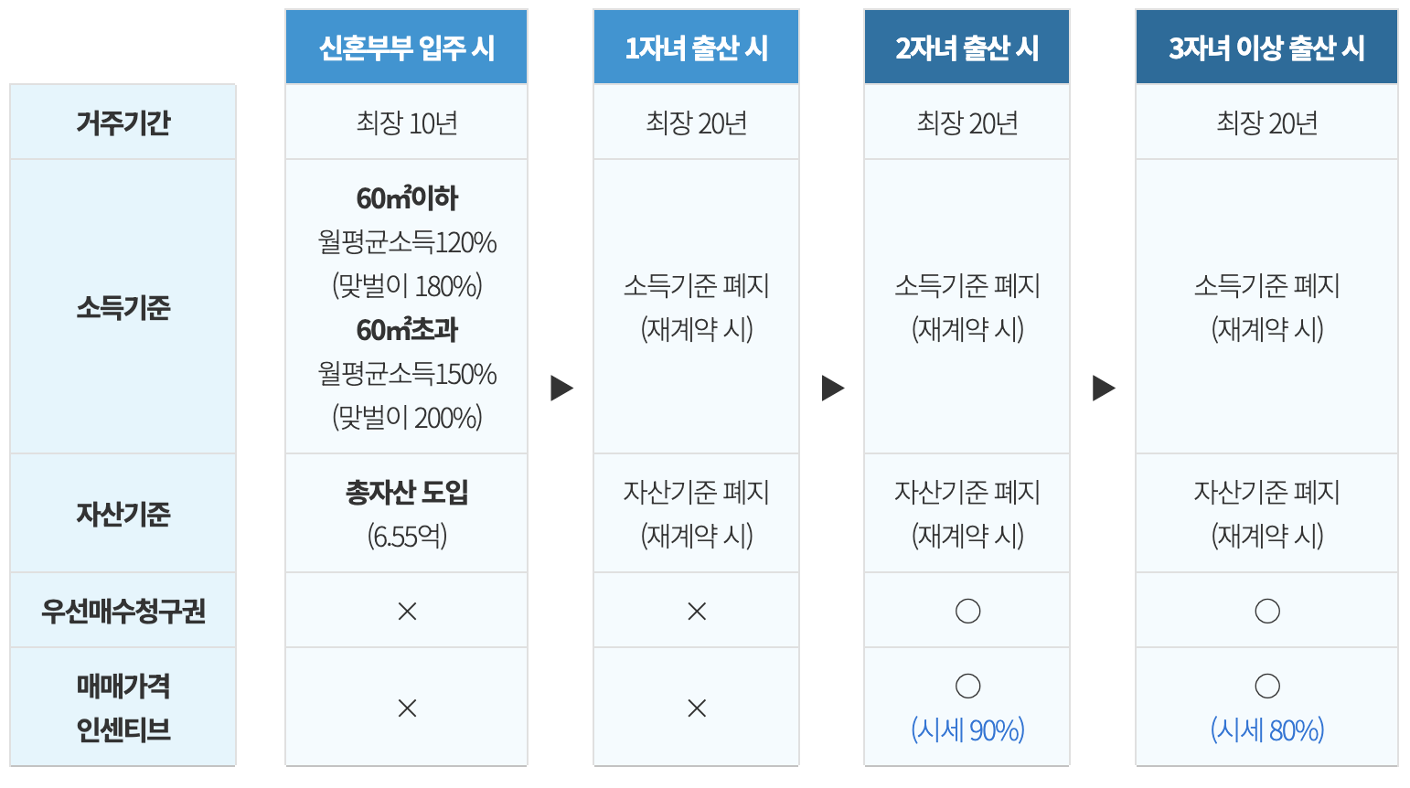 1자녀 출산가구에 대해 거주기간을 10년에서 20년으로 연장하고, 2자녀 이상 출산가구의 경우 해당 주택을 시 세보다 최대 20% 저렴한 가격에 제공한다. 또한, 입주 이후 자녀 증가에 따라 세대원수가 증가하는 가구에 대해 입주 이후 10년 차부터 더 넓은 평형으로 이주를 지원하며, 9년 차부터 신청을 받을 예정이다.