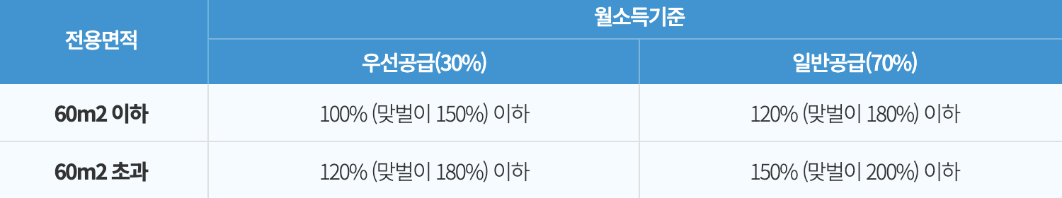 - 전년도 도시근로자 가구당 월평균 소득의 140%(배우자가 소득이 있는 경우에는 160%) 이하일 것