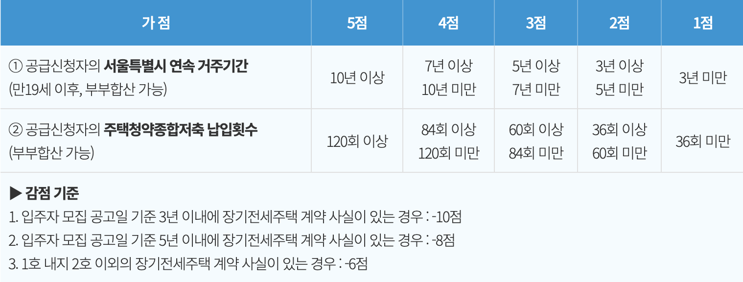 서울시는 20~30대 초반 젊은 신혼부부의 입주 기회를 확대하기 위해 무주택기간 가점을 폐지하는 대신 서울 시 연속 거주기간/청약저축 납입 횟수로 가점을 부여 키로 입주자 선정 기준을 수정했다. 높은 점수순으로 선정하되 동점자는 추첨한다.
