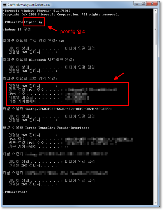 또는 ipconfig 명령어를 입력하면 현재 네트워크 설정을 확인할 수 있습니다. 외부 IP가 아닌 내부 IP 주소를 확인할 수 있지만, 라우터의 정보를 통해 외부 IP를 유추할 수 있어요.