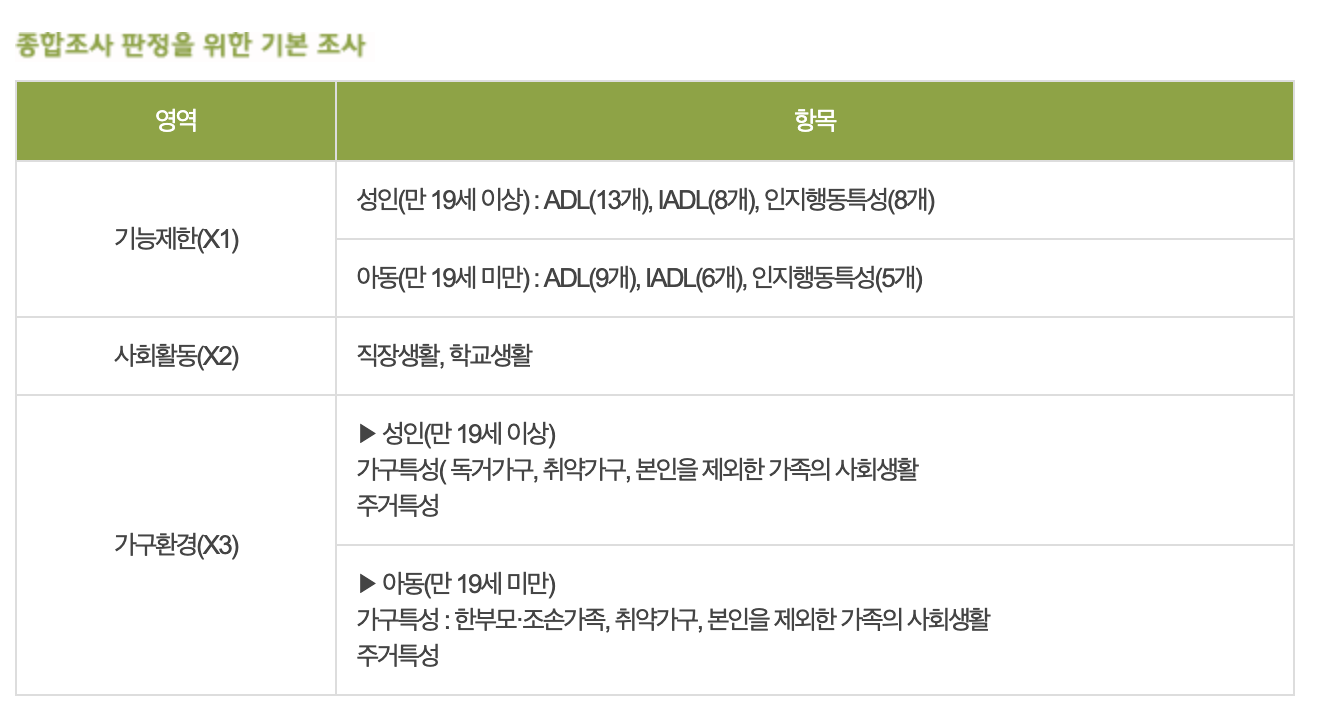 - 국민연금공단 방문조사 담당자가 신청인의 신체•정신기능의 상태 및 활동지원이 필요한 정도 등을 조사하고, 결과를 작성한 표를 말합니다.