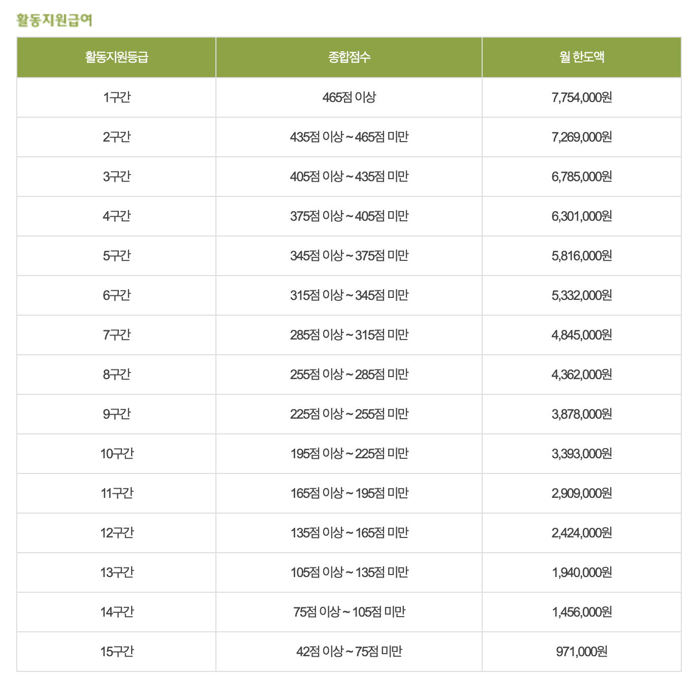 • 심신상태 및 활동지원이 필요한 정도 등을 평가한 서비스 지원 종합조사 결과에 따라 산정된 종합점수를 고려하여 활동지원 등급이 결정됩