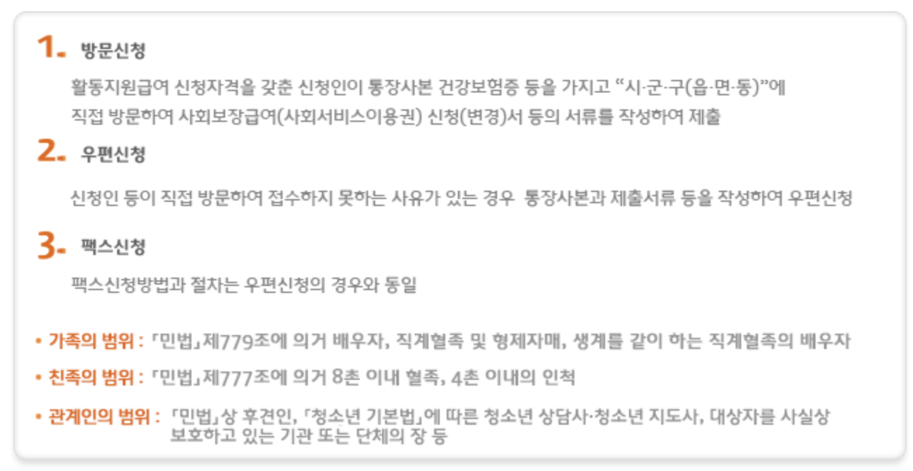 그렇게 되려면 장애인 활동지원 서비스를 이용하려면 주소지 주민센터 신청한 후에 일정 심의를 거쳐서 급여의 형태로 지원받을 수 있습니다. 이제 자격 및 신청방법에 대해서 알아보겠습니다.