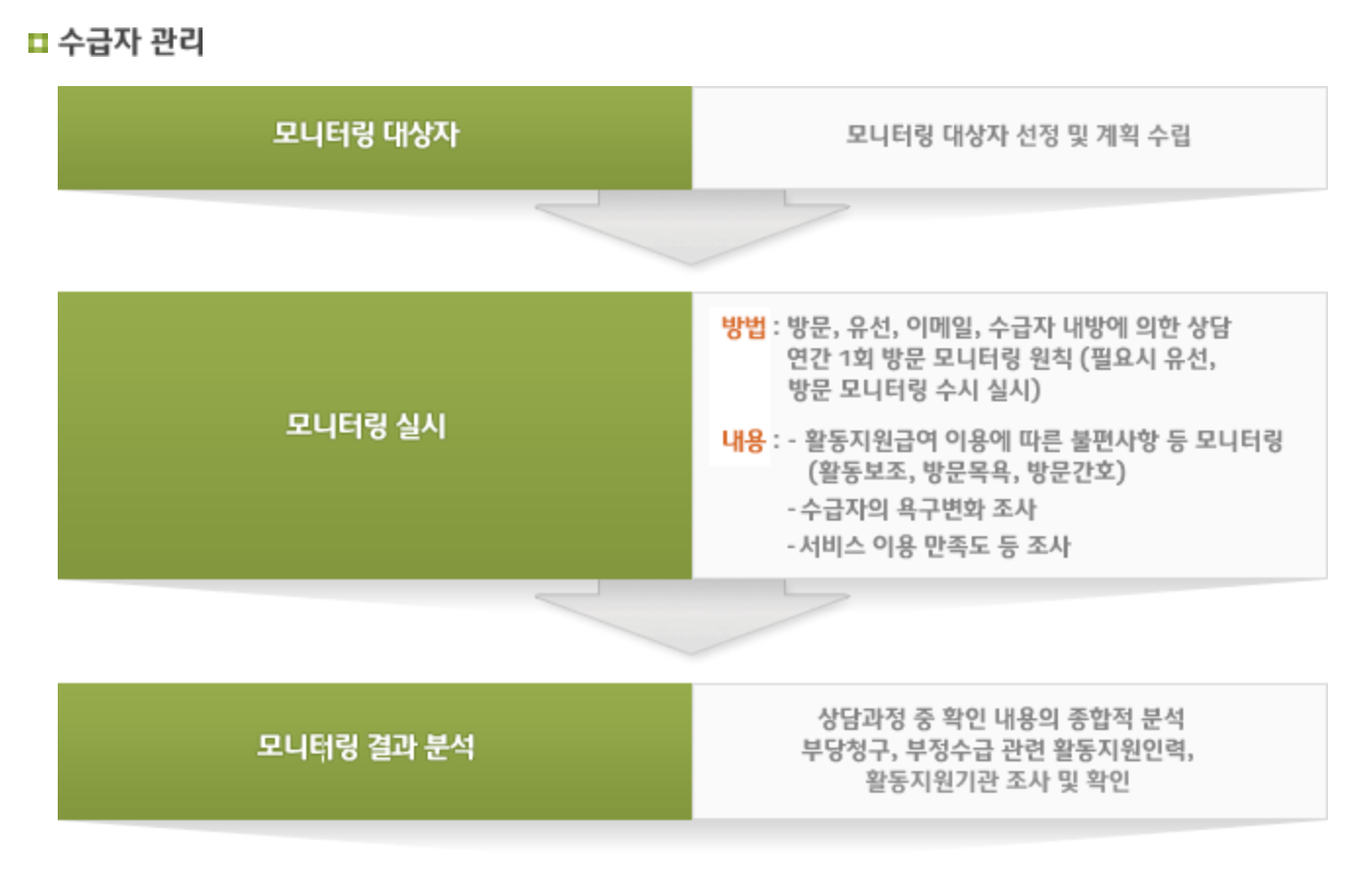 - 활동지원급여가 제공계획서에 따라 제공되고 있는지 등을 확인하고, 수급자의 욕구 등을 파악하기 위해 방문, 유선, 이메일에 의한 상담 조사
