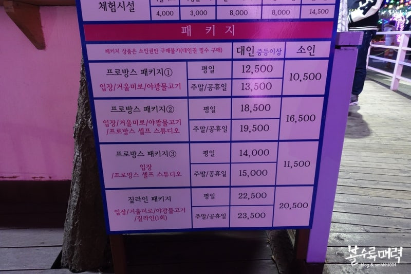 또한, 물놀이장과 빛축제 포토랜드를 포함한 패키지의 경우, 주말과 공휴일에는 30,000원의 입장료가 필요해요.