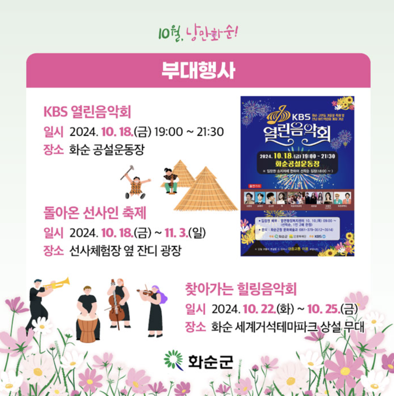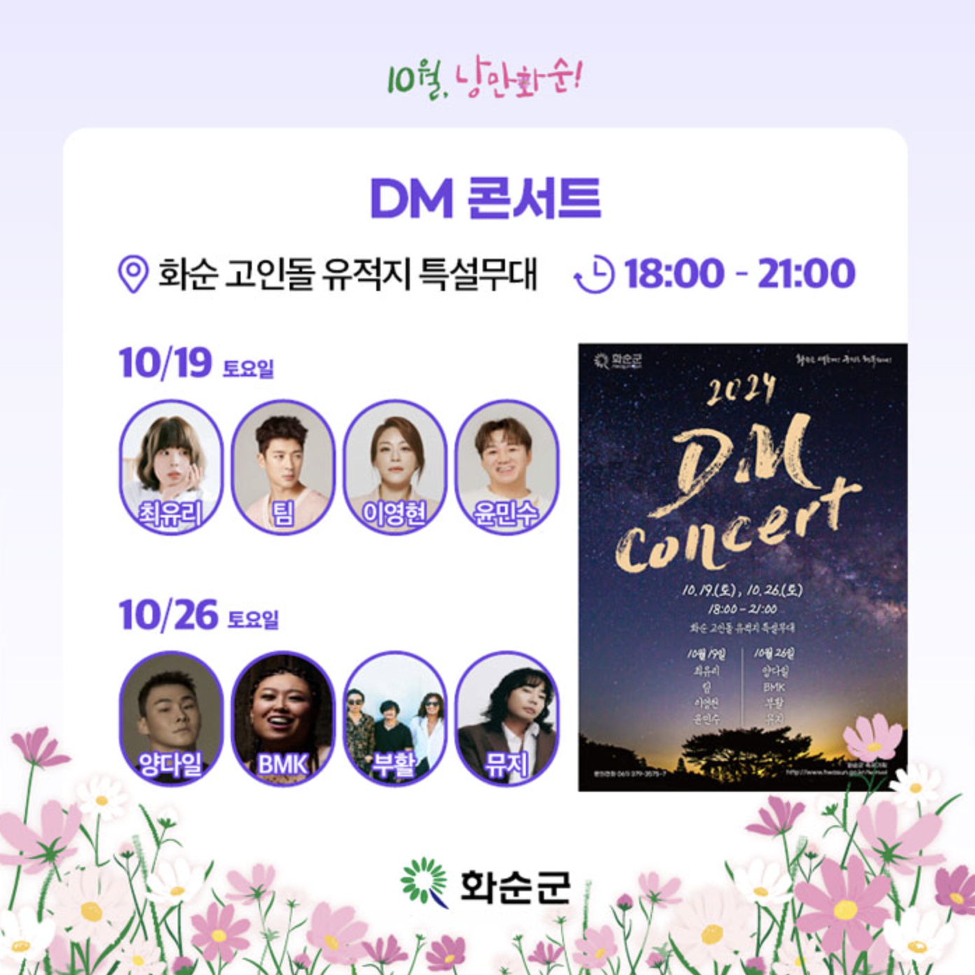 2024 화순 고인돌 가을꽃 축제 DM 콘서트: 10. 19.(토) / 10.26.(토) 18:30~21:00, 축제 특별 공연