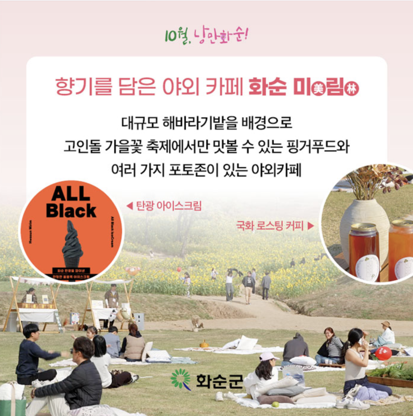 - 필수 해시태그 : #화순고인돌가을꽃축제 #화순고인돌유적지 #개미산전망대 #화순꽃강길음악분수 #남산공원 #고인돌시장