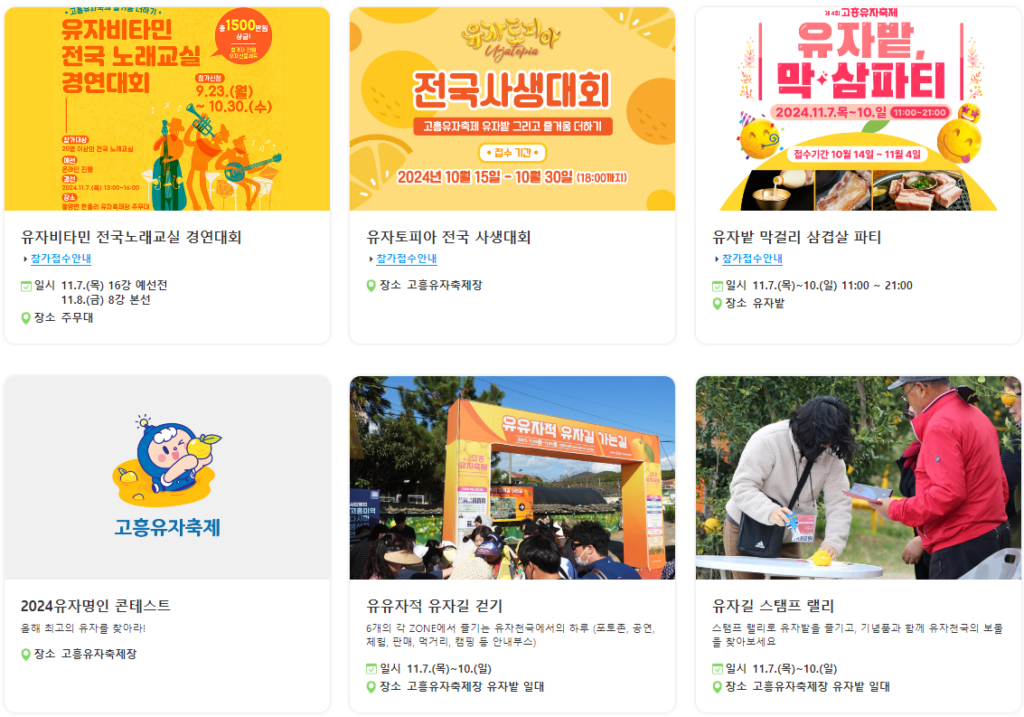 [3] NAVER - 고흥가볼만한곳 고흥유자축제 일정 소개 (https://in.naver.com/chicagoman9/contents/internal/755100072836576)